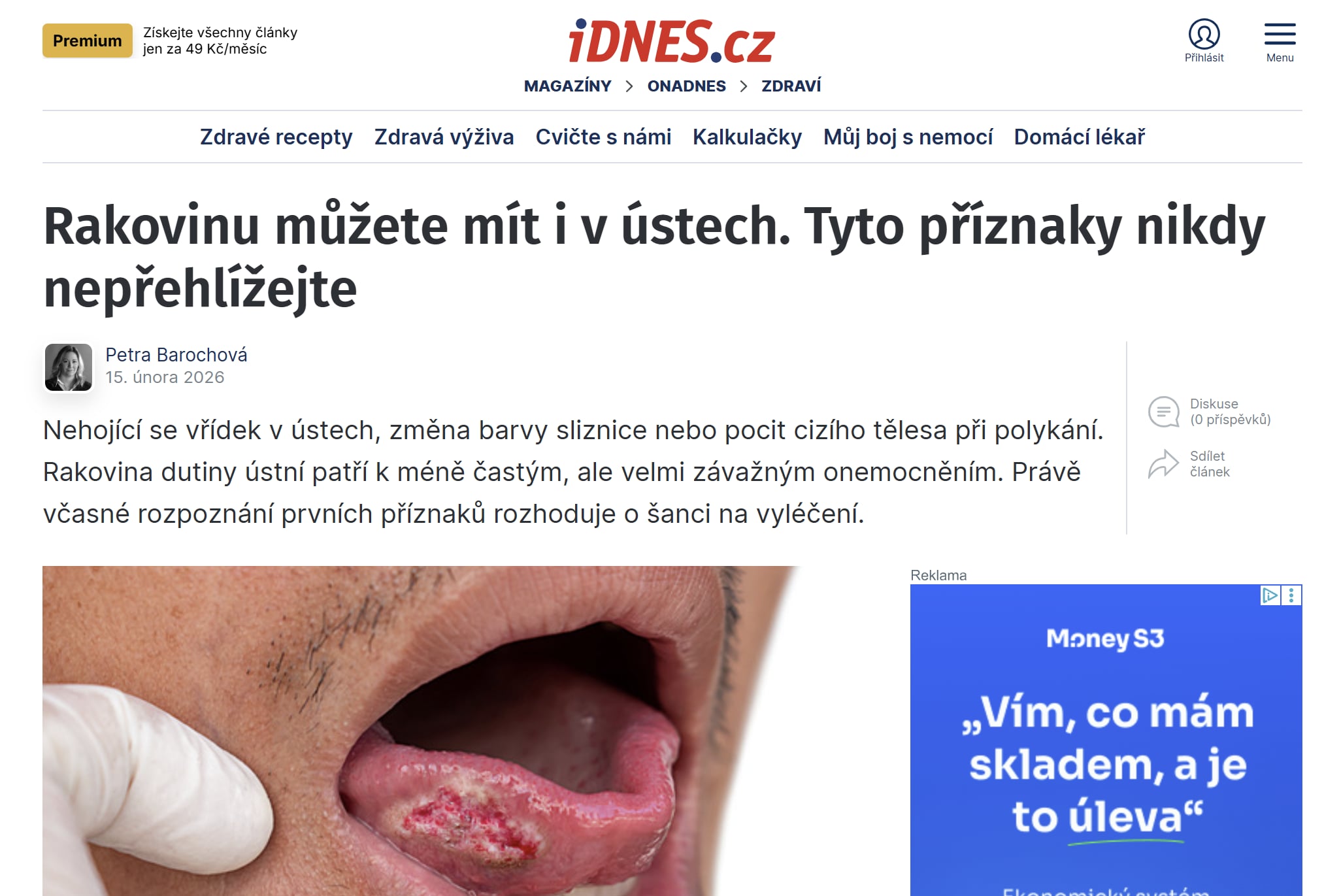 Na portálu iDNES.cz vyšel článek věnovaný závažnému, ale často podceňovanému tématu – rakovině dutiny ústní. Toto onemocnění se může zpočátku projevovat nenápadně, a právě proto je důležité o něm mluvit a nepodceňovat prevenci.
